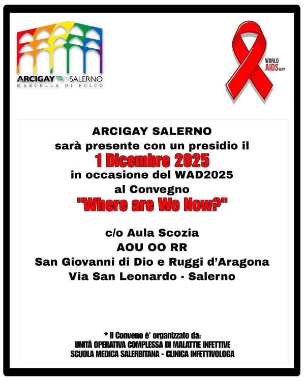 Arcigay Salerno parteciperà con un intervento del Delegato alla Salute di Arcigay Edoardo Palescandolo, al convegno scientifico “Where Are We Now?”, presso l’Aula Scozia dell’AOU “San Giovanni di Dio e Ruggi d’Aragona”, contribuendo al dibattito tra professionisti, specialisti e realtà attive nel campo della prevenzione e del monitoraggio dell’HIV. Saranno presenti al convegno anche le associazioni LILA e ANLAIDS.